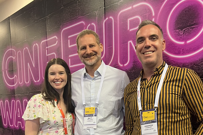 While at CineEurope, Cinema United’s Chief Communication Officer Andrew Stewart, Cinema United’s Director of Membership and Global Affairs Erin Von Hoetzendorff, and CinemaCon’s Associate Managing Director Matt Pollock met with exhibitors from around the world—Svenska Bio, Cineworld, Pathe, Omniplex, Kinepolis, Nordisk Film, Cinemark, Cineplexx, Cinépolis, and Odeon—to discuss the current state of the industry and topics that unite all exhibitors such as continued innovation both in programming and cinema renovations.